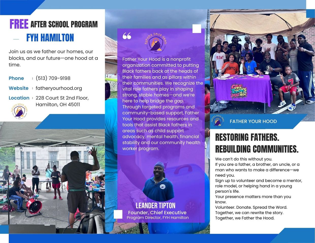 Father Your Hood, a nonprofit organization based in Hamilton, Ohio, whose mission is the creation of resources and pathways to services to help restore black fathers at the head of black households and pillars in their communities. Father Your Hood was founded in 2023 by LeAnder Tipton, a community member in the city of Hamilton who recognized the need for a local organization dedicated to helping Black Fathers and those disenfranchised by not having their fathers in the home. Since then, we have grown into a thriving nonprofit, serving hundreds of fathers and youth each year.